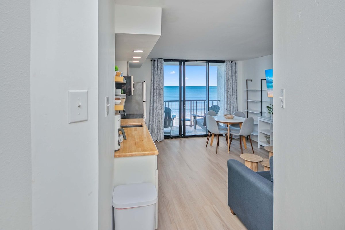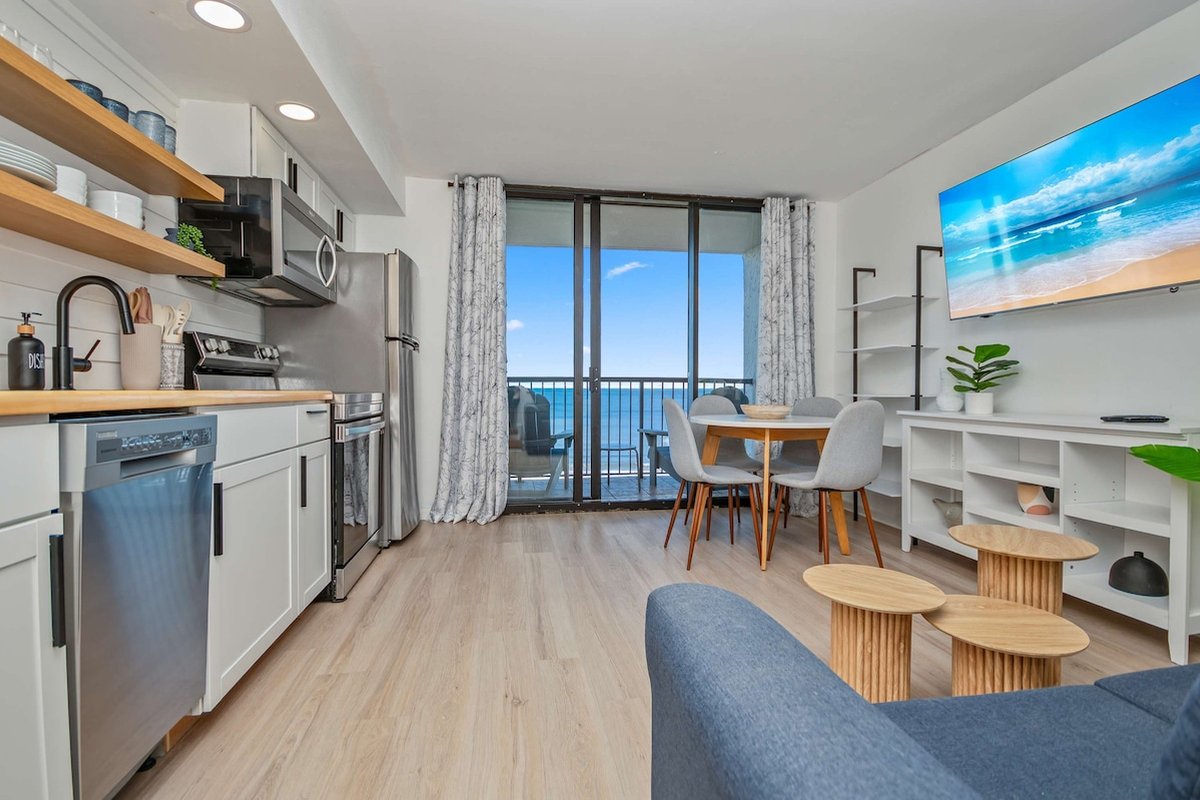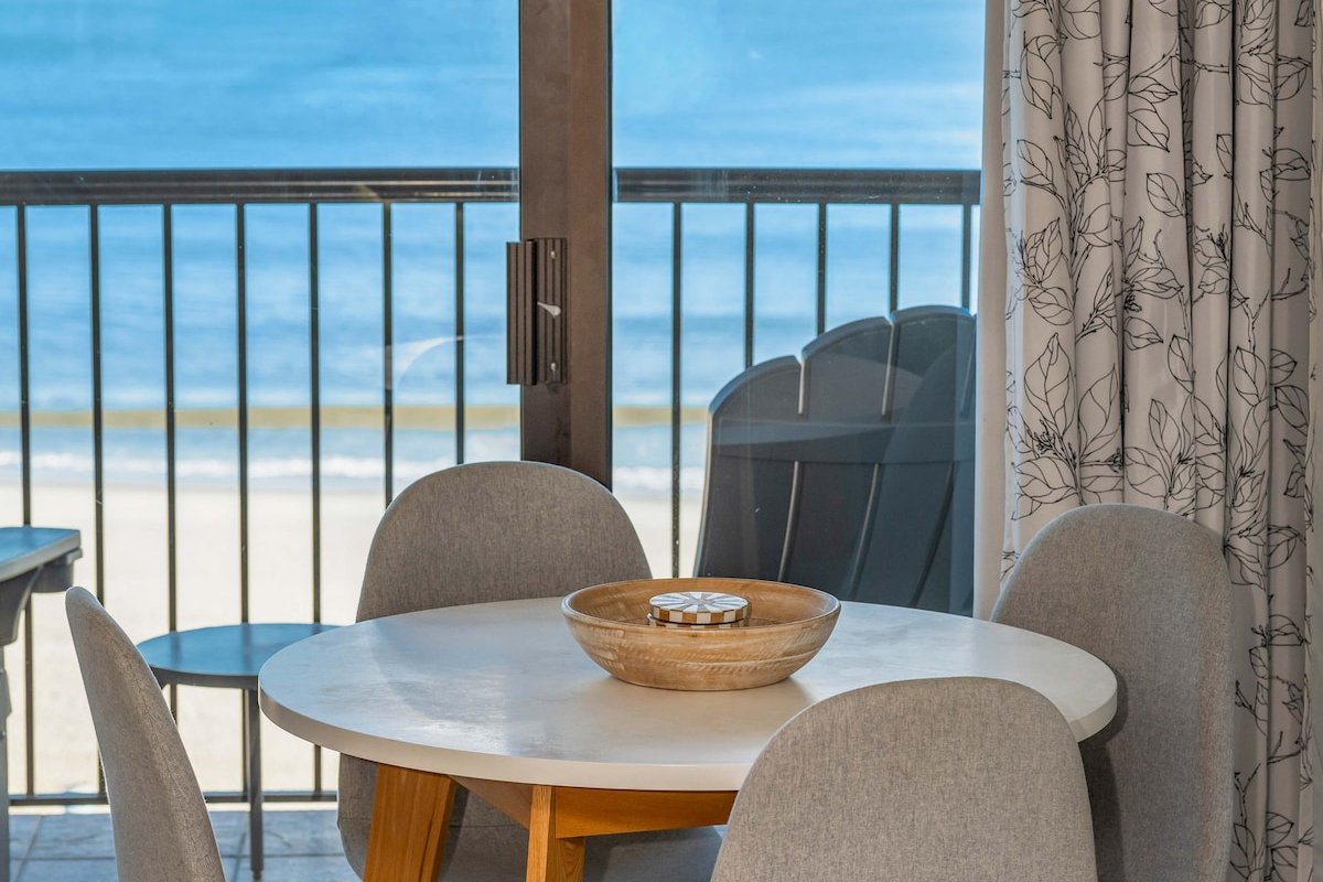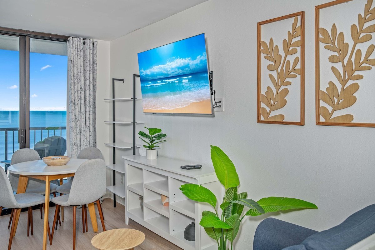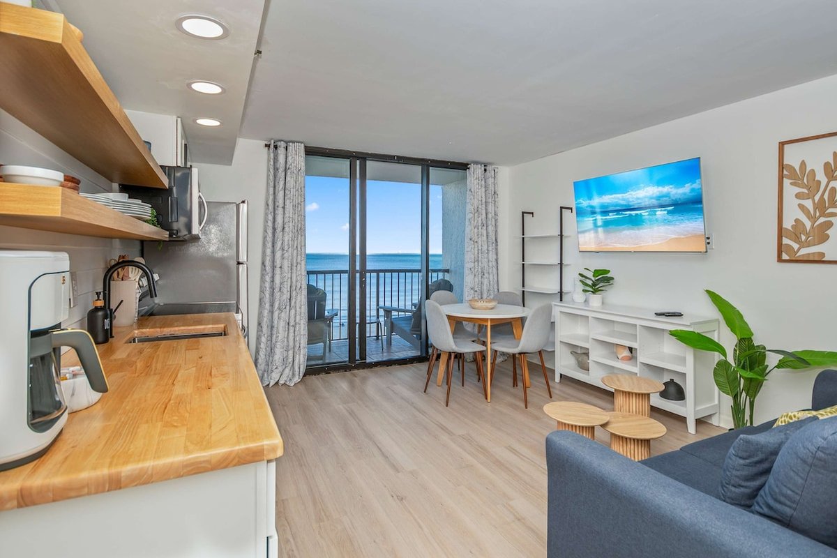 This 7th-floor condo has been newly remodeled with modern finishes and furnishings. The living area features a sleeper sofa and opens to your private oceanfront balcony through sliding glass doors. The king bed provides a comfortable night's sleep with ocean views just steps away.