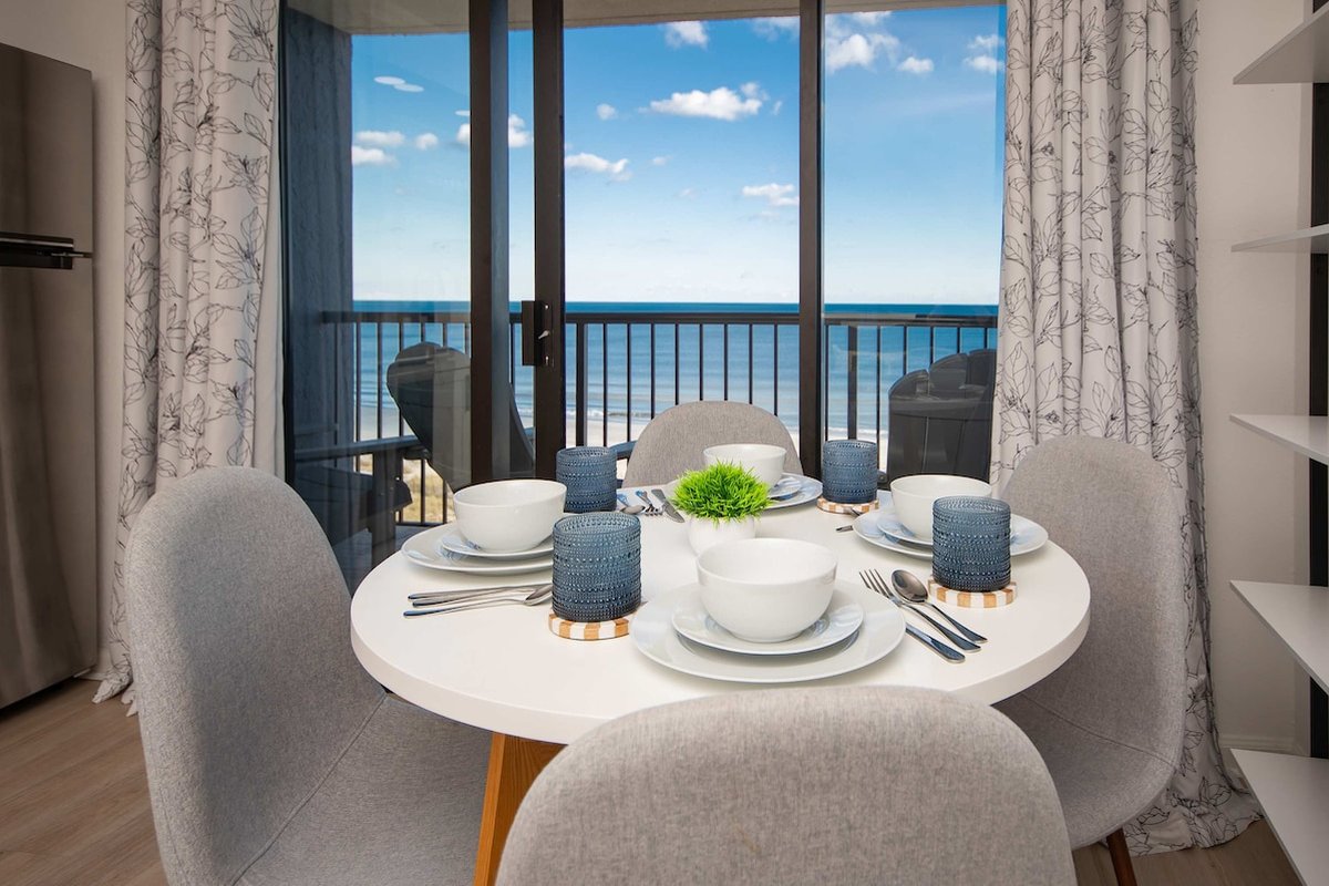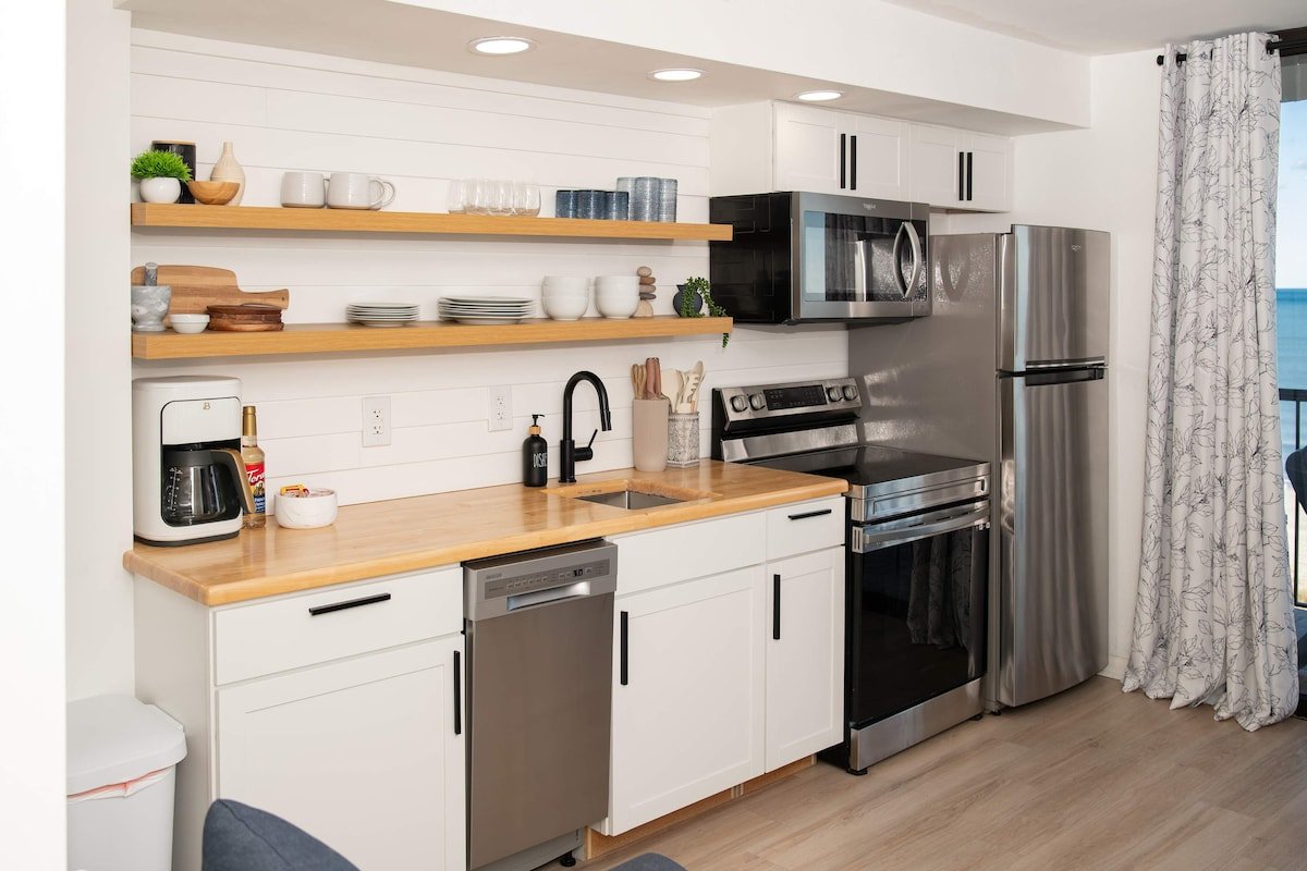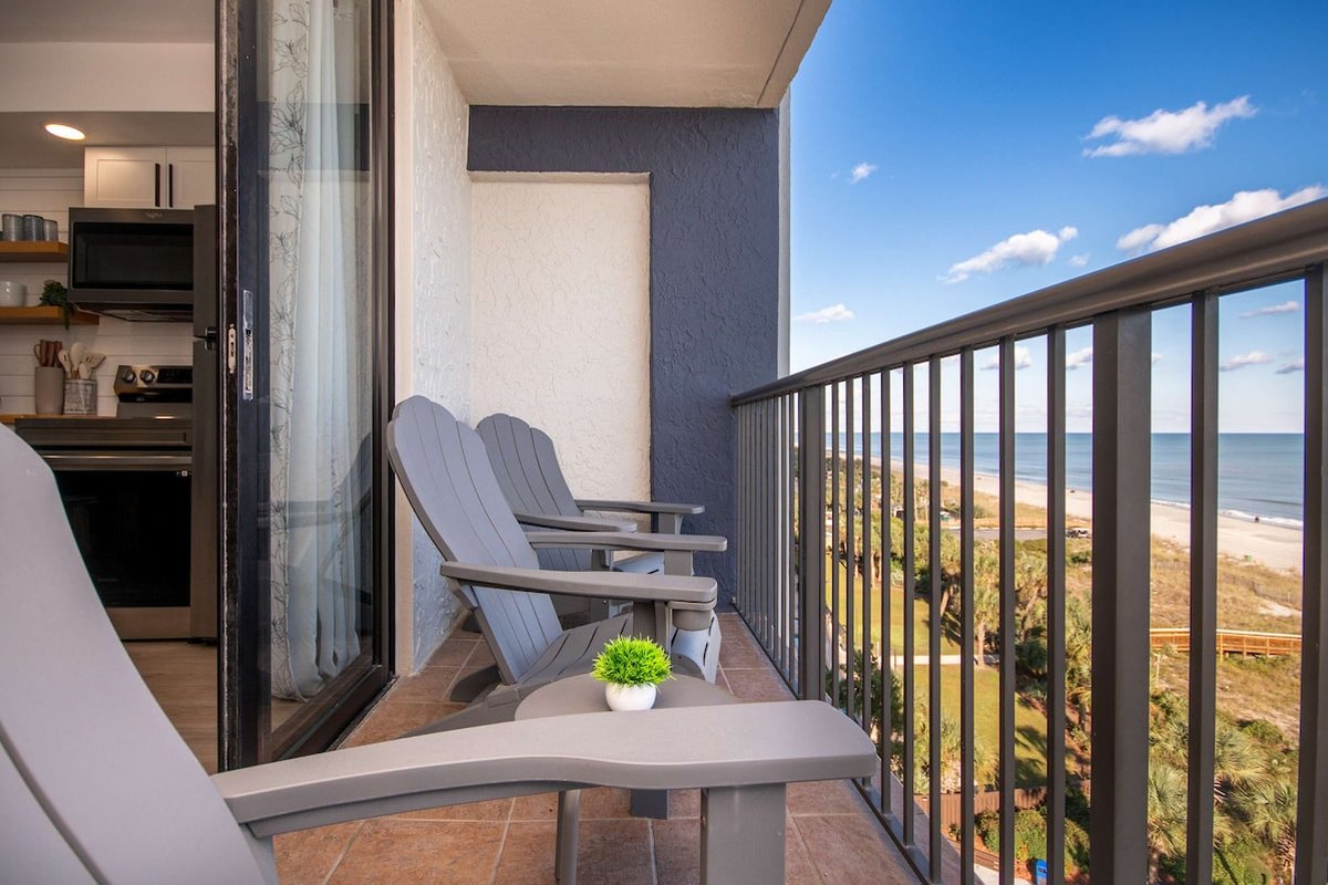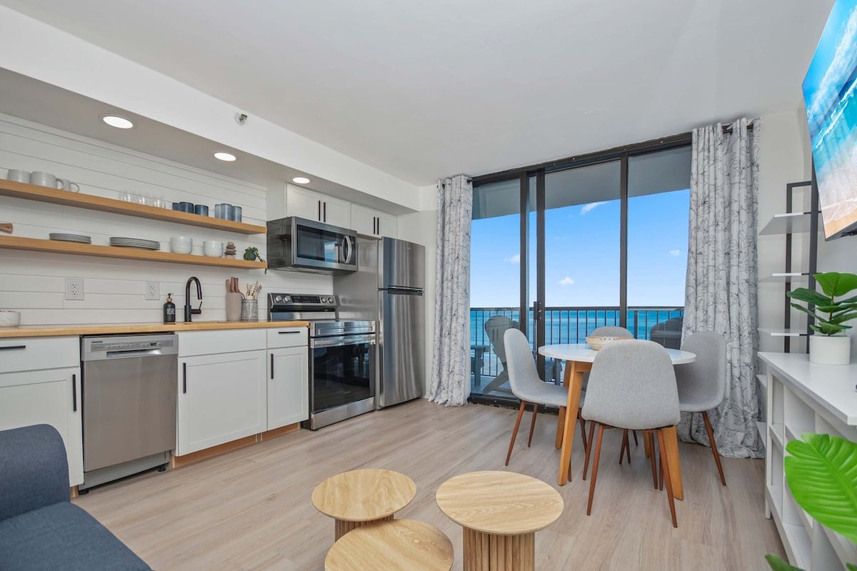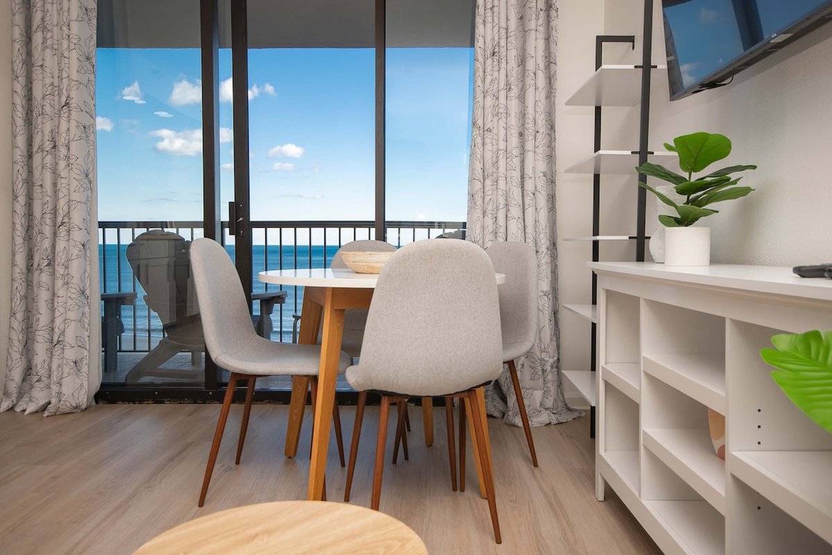 This 7th-floor condo has been newly remodeled with modern finishes and furnishings. The living area features a sleeper sofa and opens to your private oceanfront balcony through sliding glass doors. The king bed provides a comfortable night's sleep with ocean views just steps away.