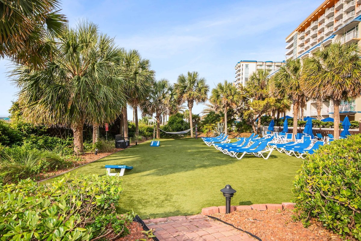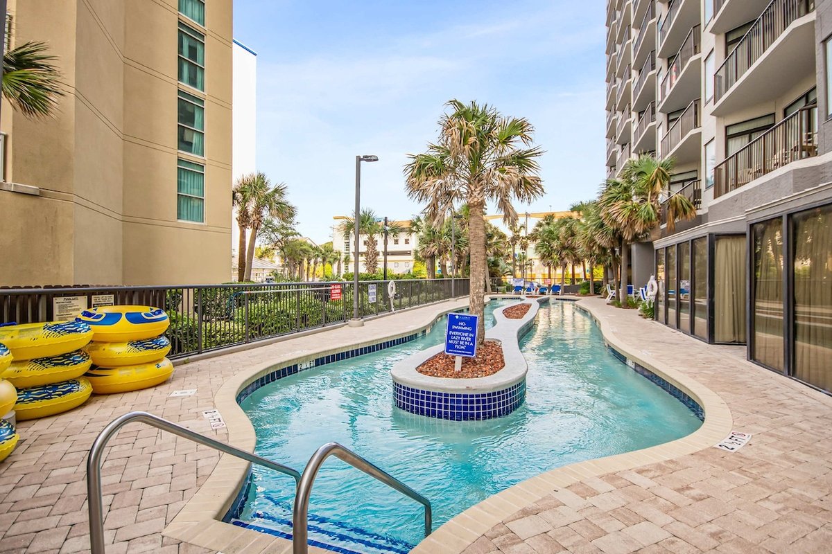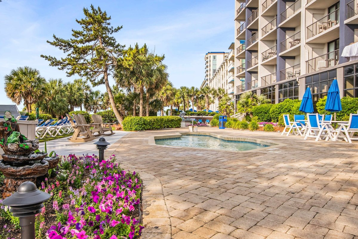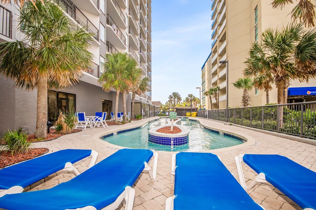 Beach Colony is one of those resorts where you could spend your entire vacation without leaving the property. Heated indoor and outdoor pools, lazy river, hot tubs, tiki bar, restaurant, coffee shop, fitness center, sauna, and an arcade keep everyone entertained. The beautifully landscaped grounds feature hammocks, loungers, and gliders spread throughout. When you're ready to explore, you're in the heart of Myrtle Beach with easy access to everything.