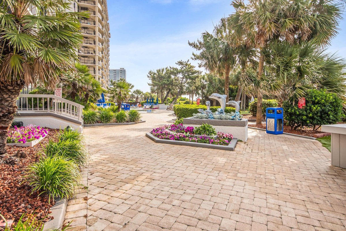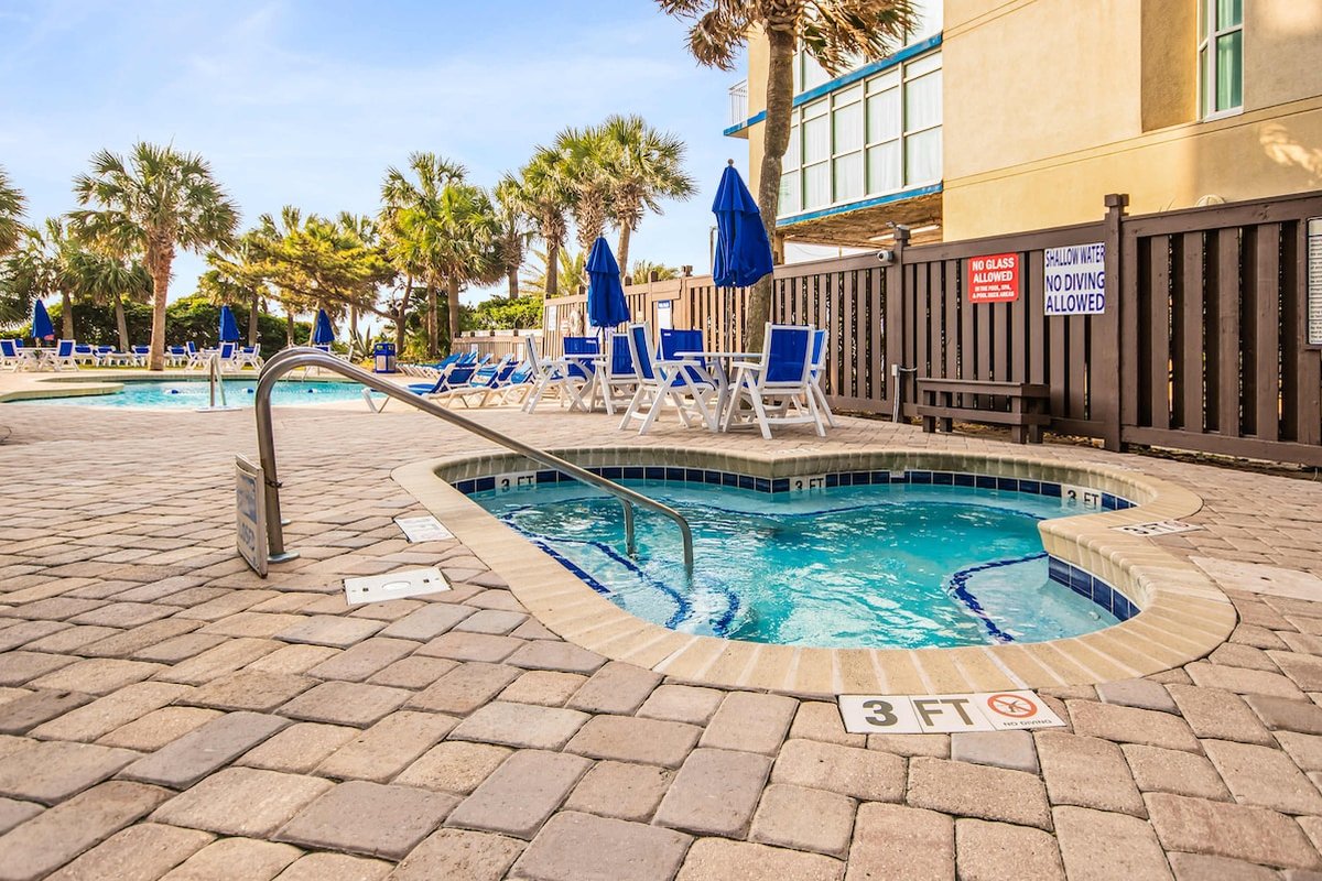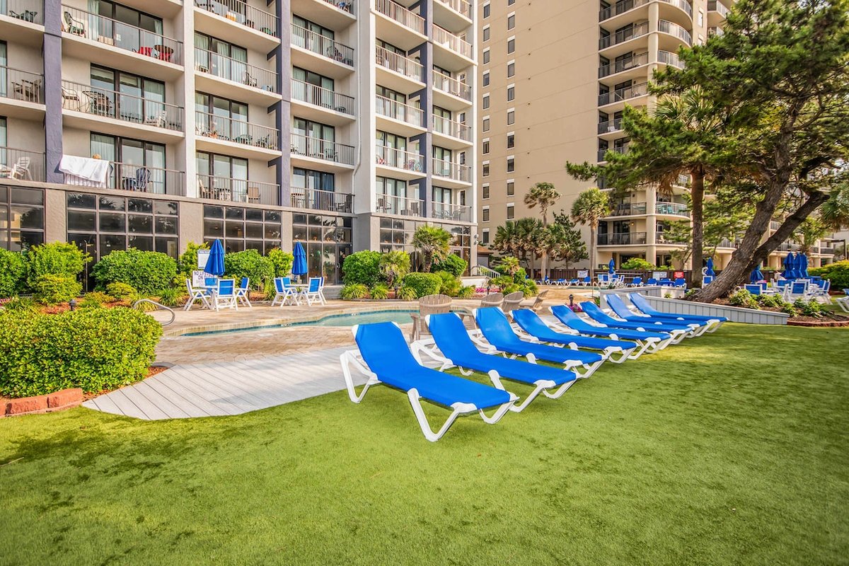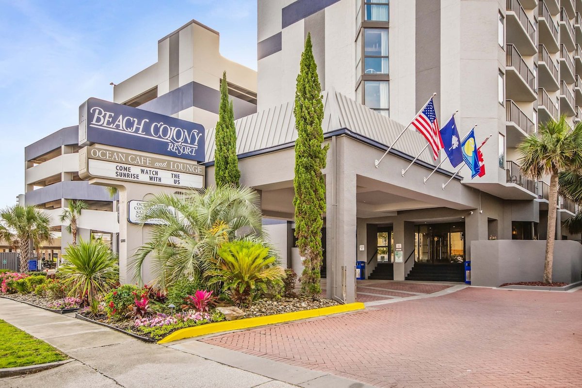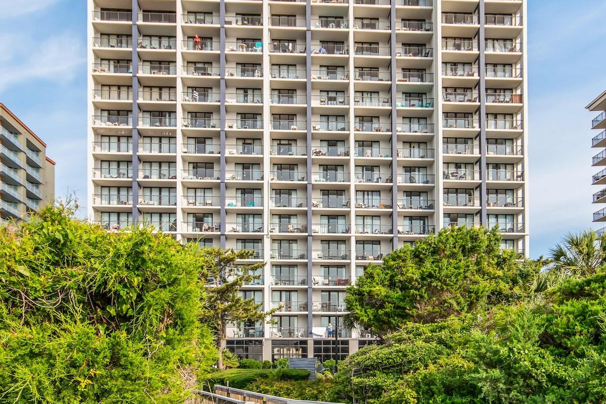 Beach Colony is one of those resorts where you could spend your entire vacation without leaving the property. Heated indoor and outdoor pools, lazy river, hot tubs, tiki bar, restaurant, coffee shop, fitness center, sauna, and an arcade keep everyone entertained. The beautifully landscaped grounds feature hammocks, loungers, and gliders spread throughout. When you're ready to explore, you're in the heart of Myrtle Beach with easy access to everything.