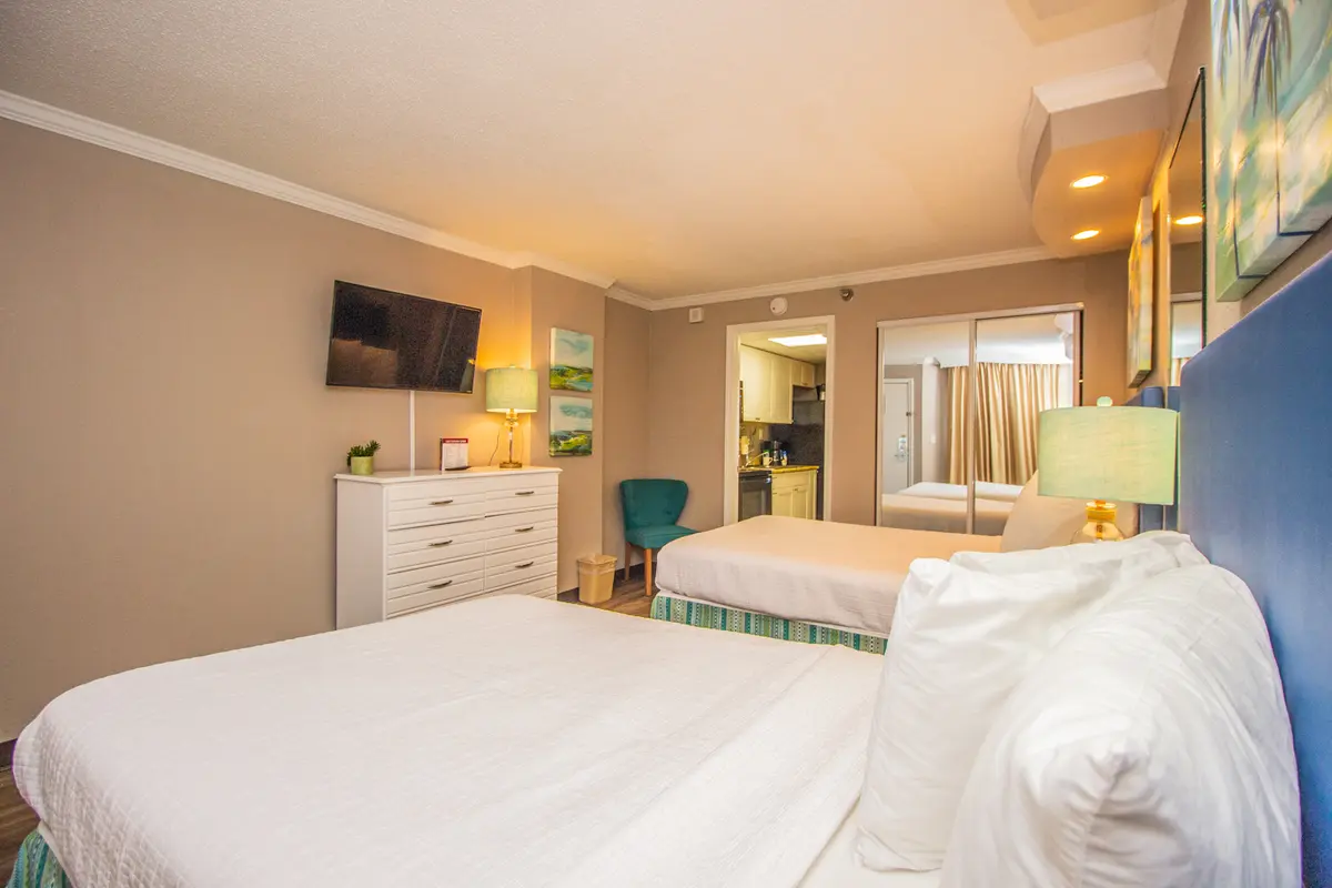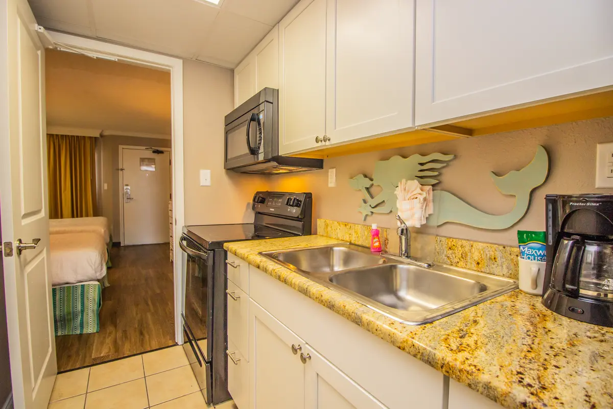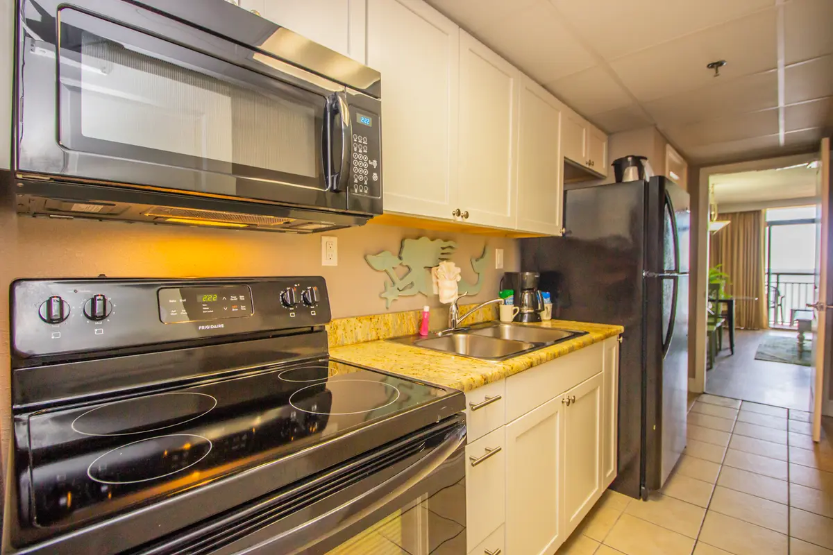 This 14th-floor one-bedroom condo has a private bedroom with two beds and a separate living area with a Murphy bed that folds out from the wall. The open-concept kitchen and living room flow together, and the sliding glass doors open to your private oceanfront balcony with expansive views.