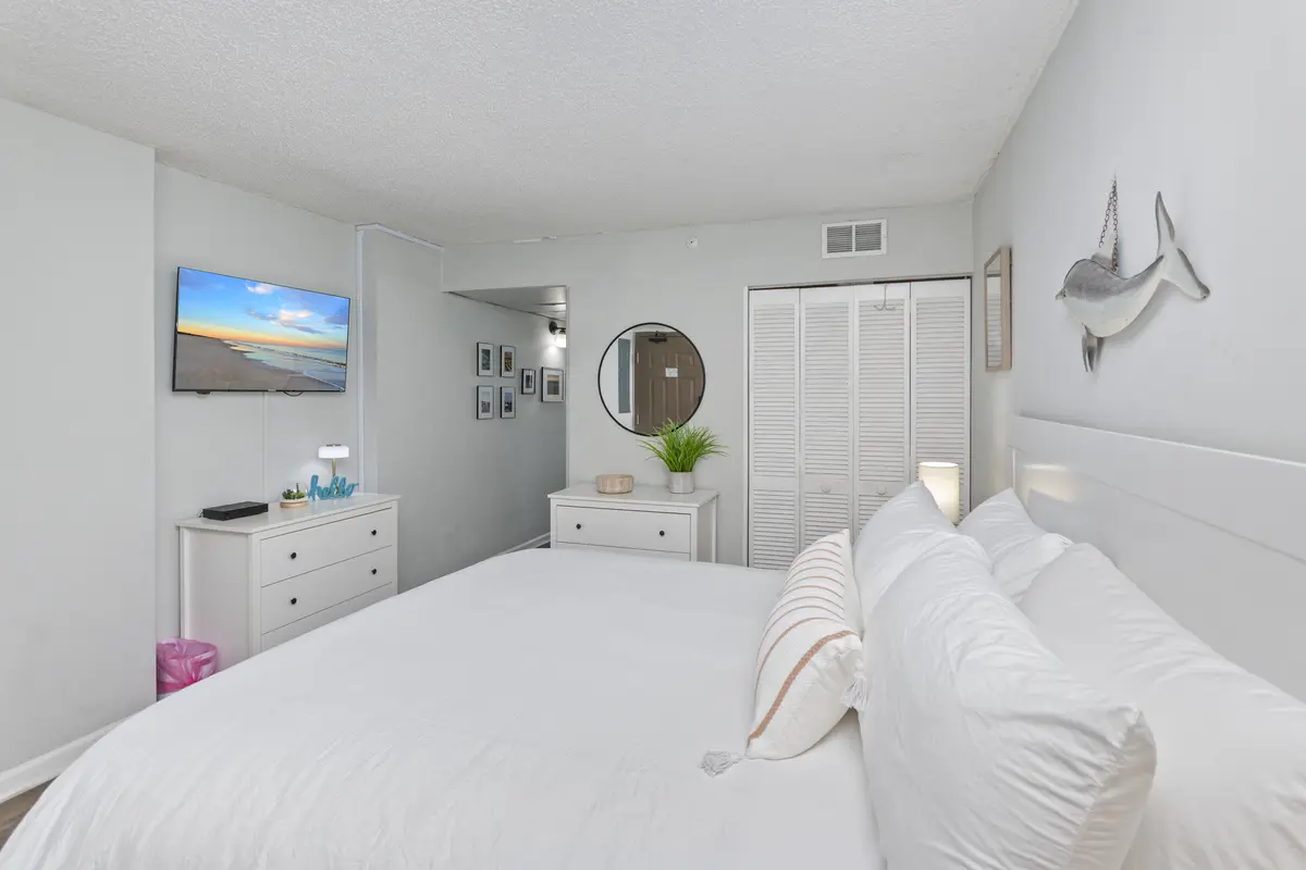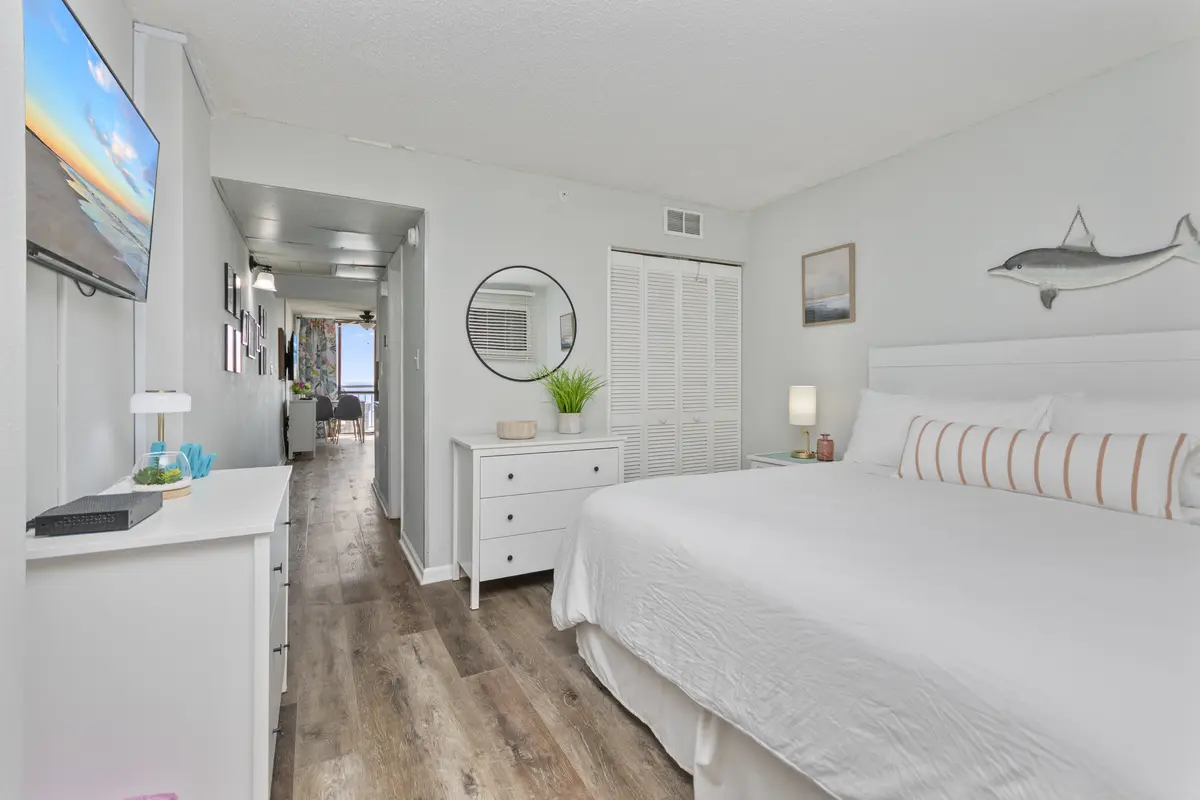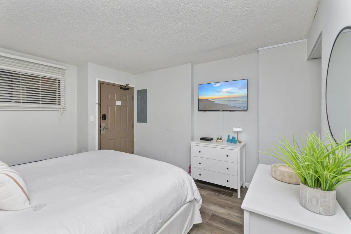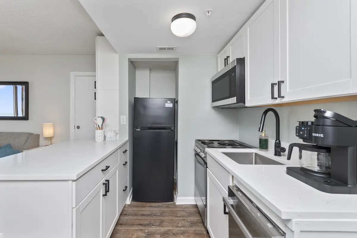 The bedroom has a king-size bed, flat-screen TV, closet, and dresser - plenty of room to unpack and settle in. The kitchen is compact but fully equipped with quartz countertops, an eat-up bar, and everything you need for simple meals, coffee in the morning, or snacks between beach trips.