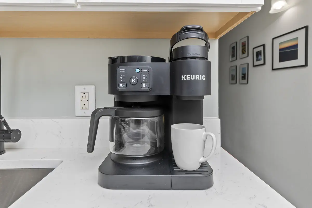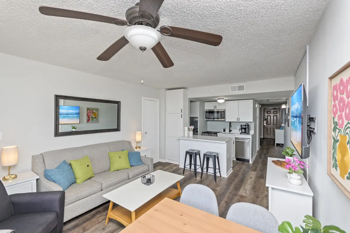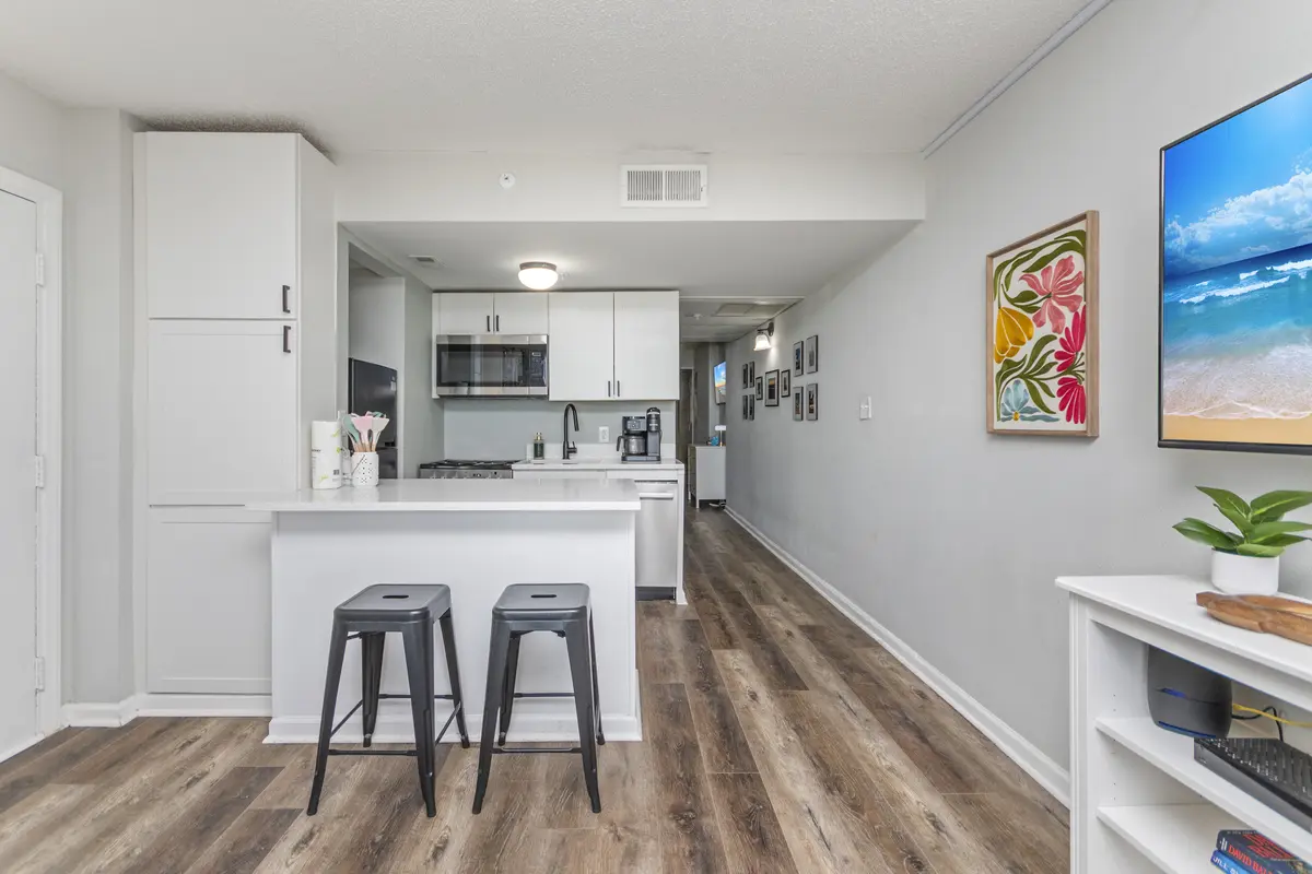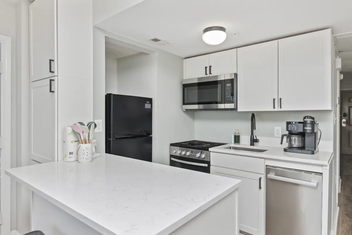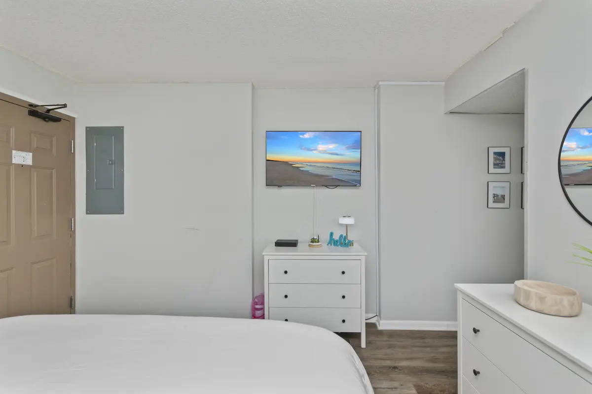 The bedroom has a king-size bed, flat-screen TV, closet, and dresser - plenty of room to unpack and settle in. The kitchen is compact but fully equipped with quartz countertops, an eat-up bar, and everything you need for simple meals, coffee in the morning, or snacks between beach trips.