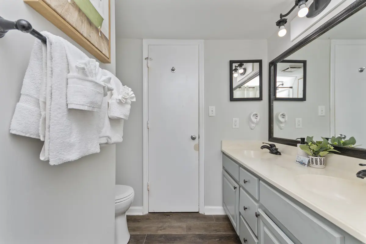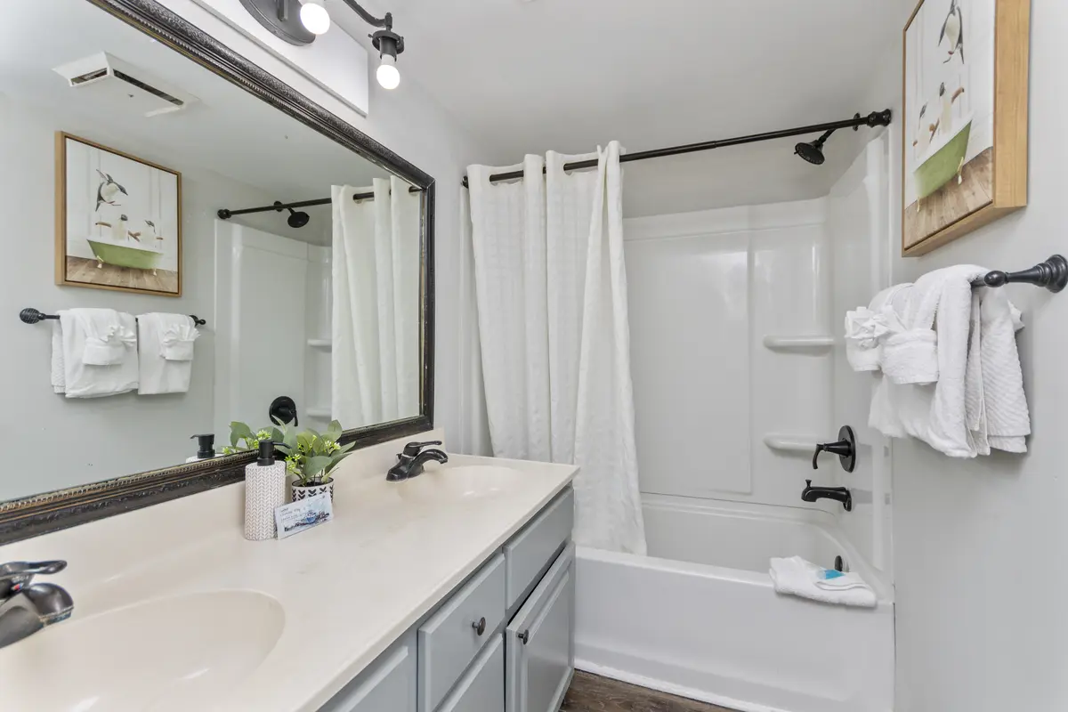 The bathroom is clean and bright with a tub/shower combo and dual vanities, making it easy for guests to get ready without feeling cramped.