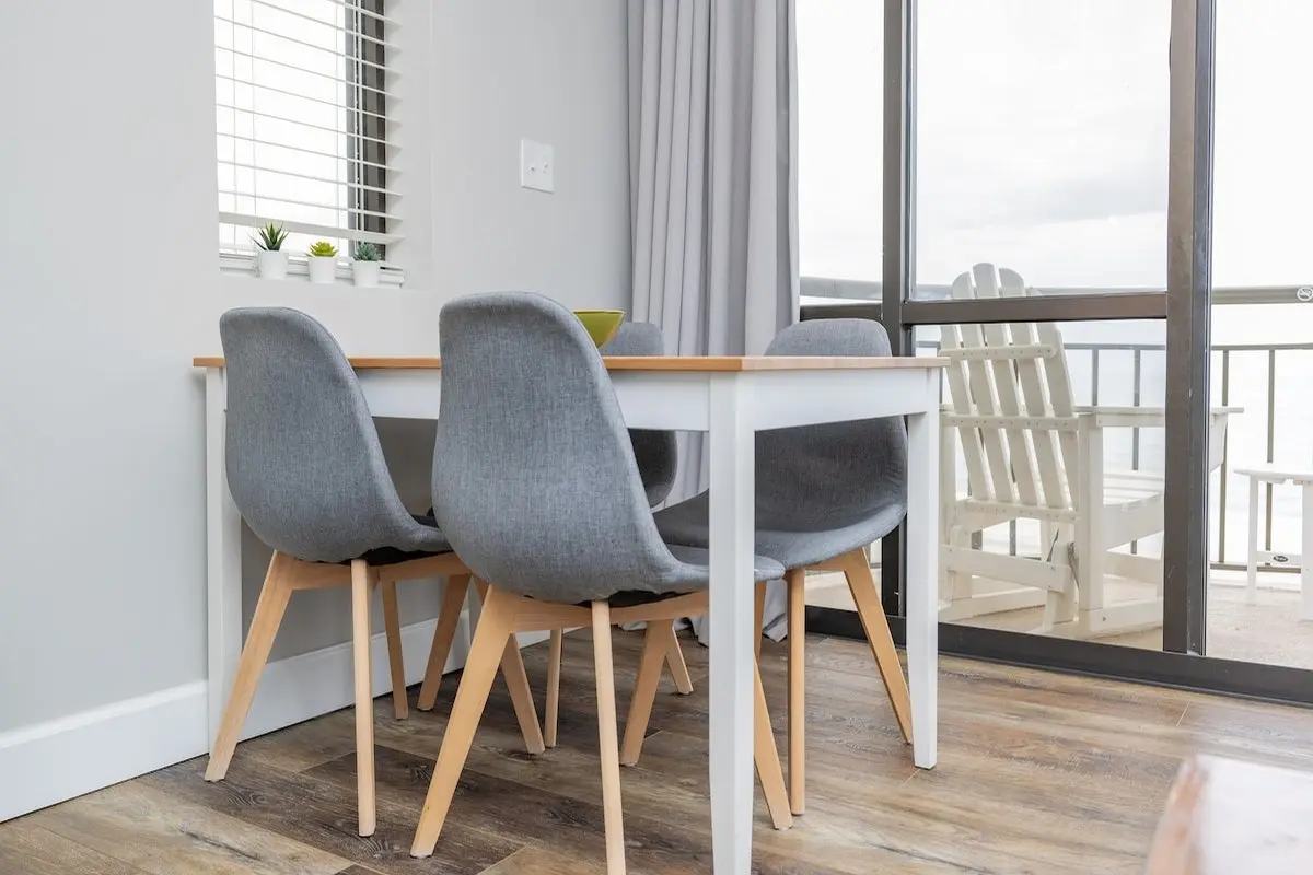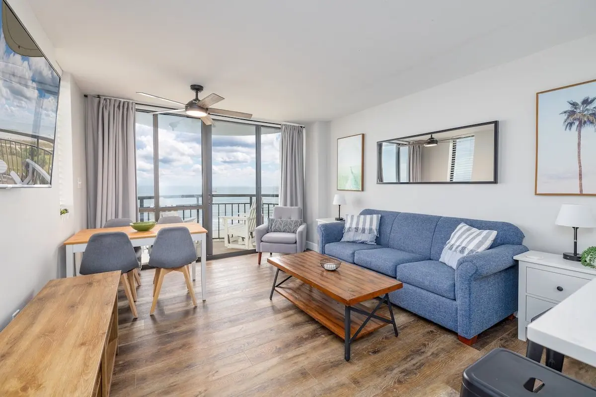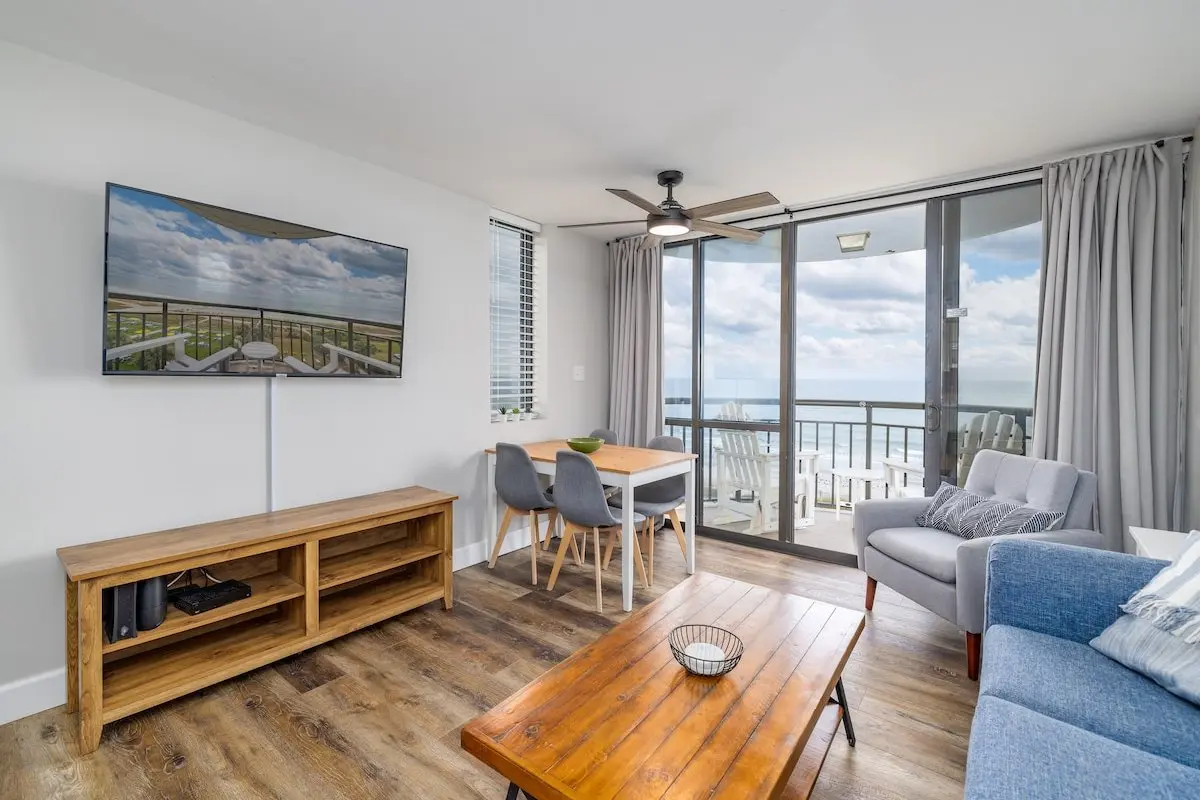 The living area is bright and open, with a comfortable queen sleeper sofa, a 55in TV, and sliding doors that lead straight out to the oceanfront balcony. You can watch the sunrise, spot dolphins along the shoreline, or simply listen to the waves without leaving the couch. There's also a dining table for four, perfectly positioned so meals come with a beach view.