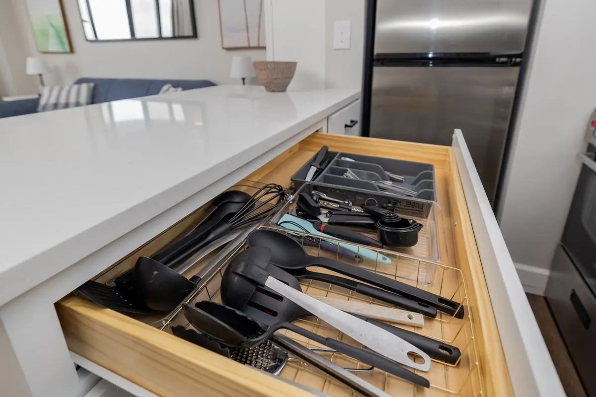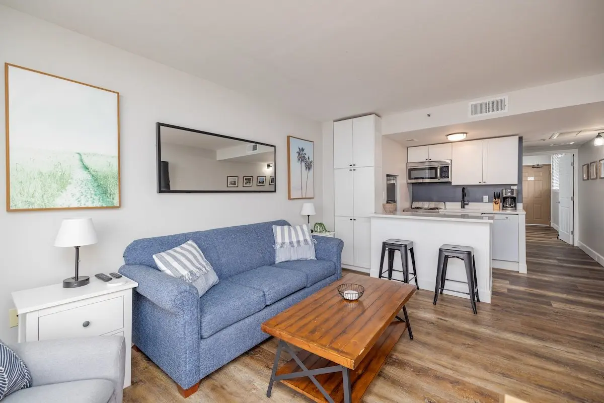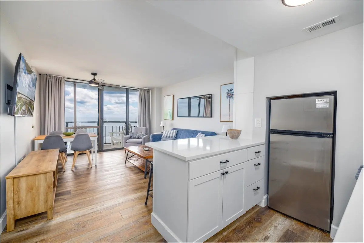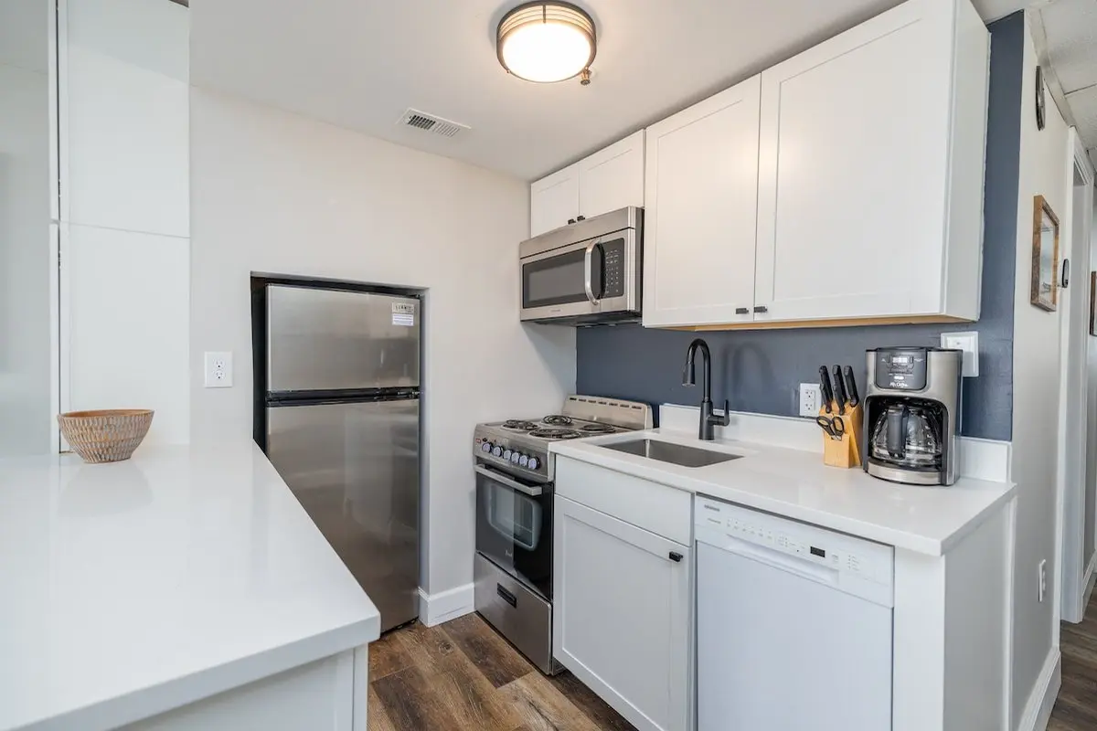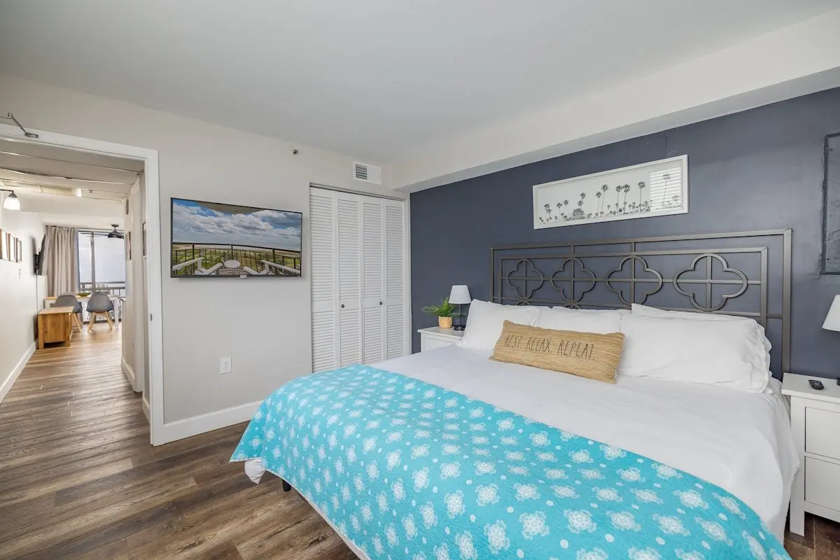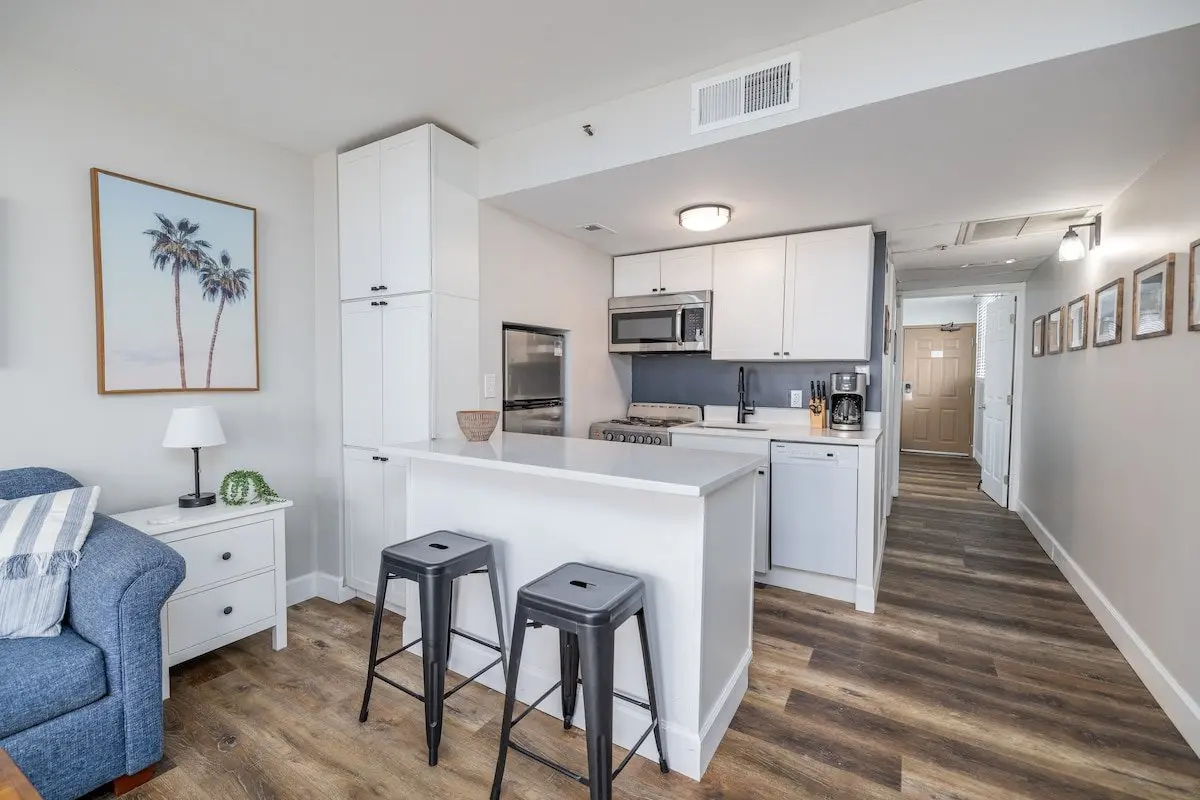The bedroom has a king-size bed, flat-screen TV, closet, and dresser - plenty of room to unpack and settle in. The kitchen is compact but fully equipped with quartz countertops, an eat-up bar, and everything you need for simple meals, coffee in the morning, or snacks between beach trips.