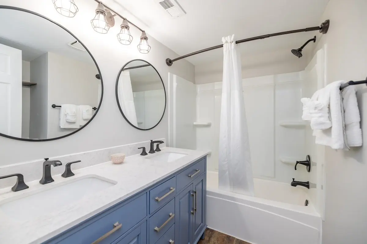 The bathroom is clean and bright with a tub/shower combo and dual vanities, making it easy for guests to get ready without feeling cramped.