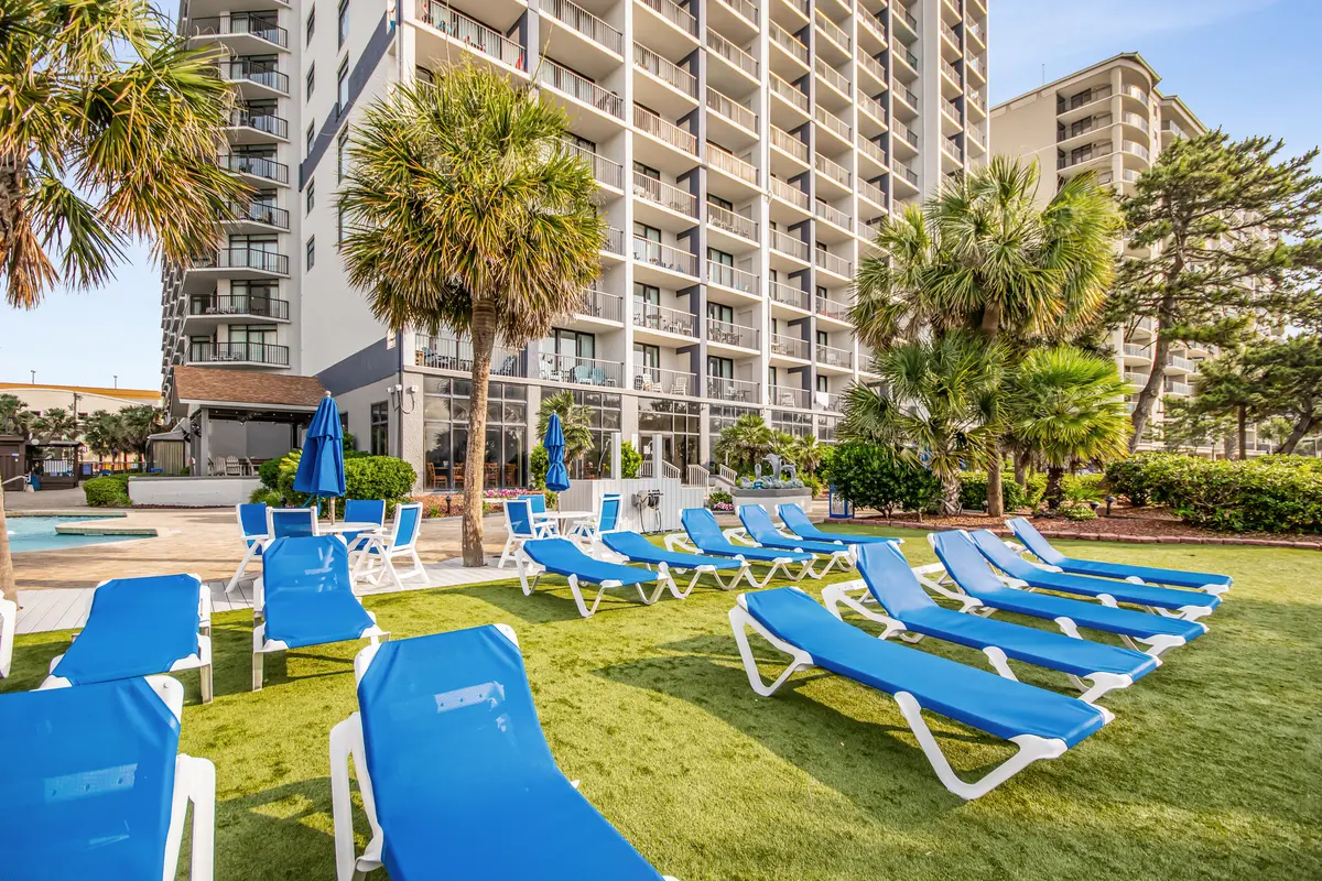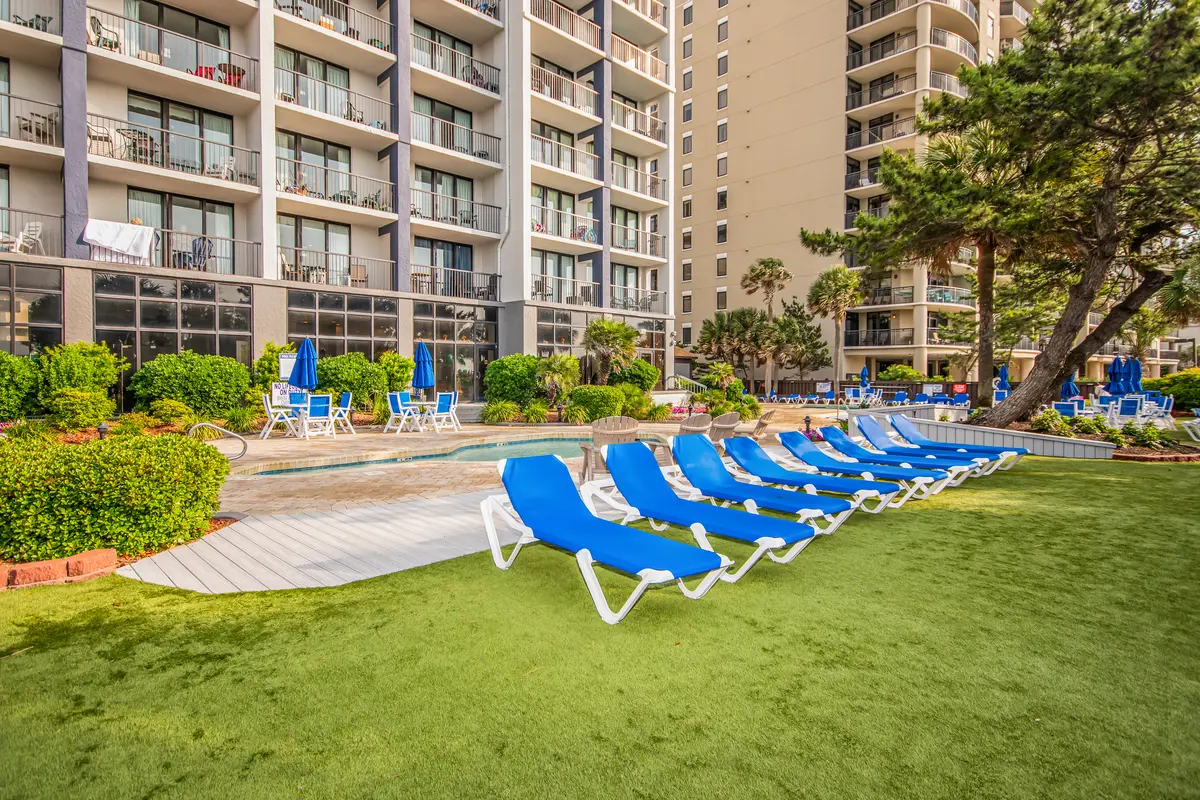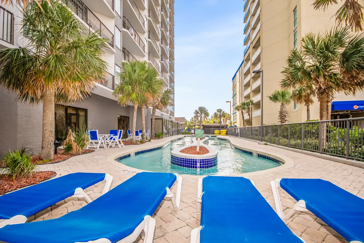 Beach Colony is one of those resorts that consistently exceeds expectations. The amenity list reads like a wish list-heated indoor and outdoor pools, lazy river, hot tubs, tiki bar, restaurant, coffee shop, fitness center, sauna, and an arcade. The landscaped grounds feature hammocks and gliders scattered throughout, which gives the whole place a relaxed, tropical feel. It's the kind of resort where you can genuinely fill an entire vacation without leaving the property, but you're also centrally located when you want to explore Myrtle Beach.